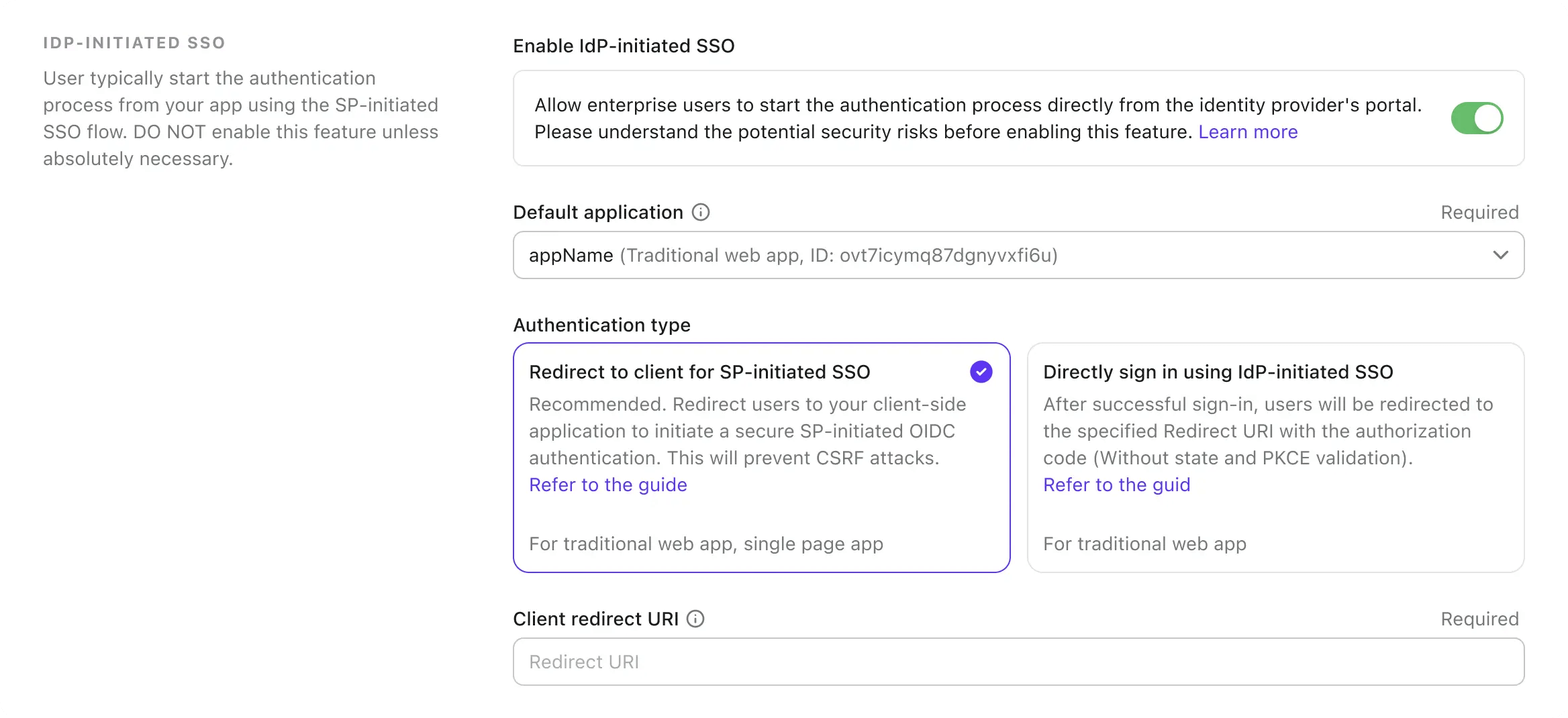Provide a Client redirect URL to redirect the user to the default SP application after the IdP-initiated SSO flow. Logto will redirect the user to this URL with the