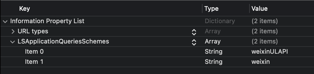 Finally open your Info.plist, add weixinULAPI and weixin under LSApplicationQueriesSchemes.